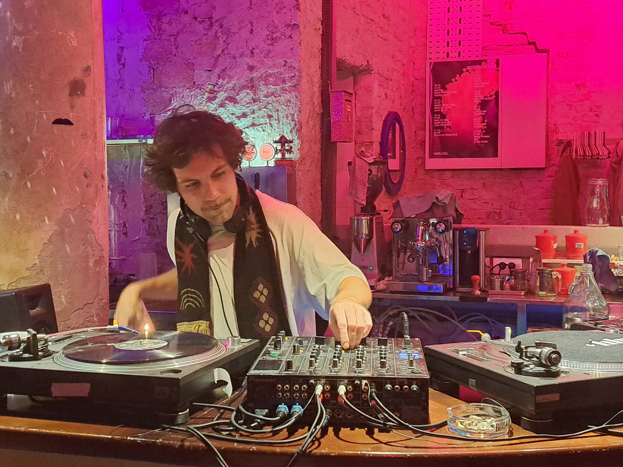 The interior embraces a raw, industrial aesthetic softened by warm lighting and carefully arranged details. The atmosphere is intimate and cozy, making it equally suitable for early-evening drinks and late-night DJ sessions. Music programming moves between local selectors and international guests, creating a subtle but steady dancefloor energy without losing its lounge character.