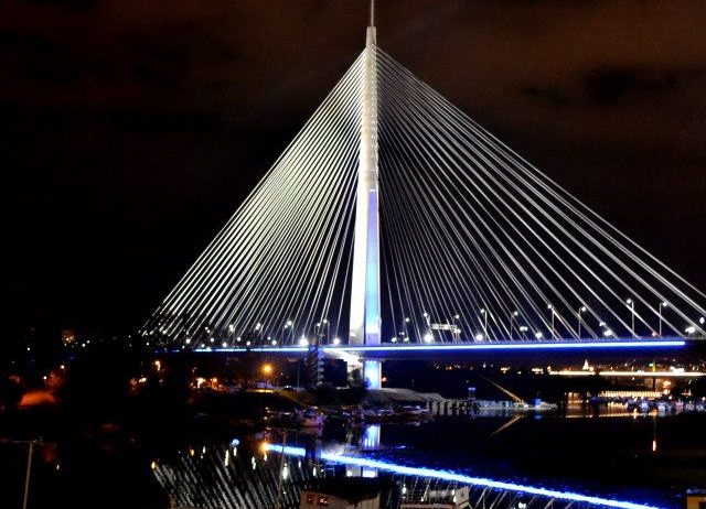 The Ada bridge (Most na Adi) is a cable-stayed bridge over the Sava river in Belgrade, Serbia. The bridge crosses the tip of Ada Ciganlija island, connecting the municipalities of Čukarica and New Belgrade. The bridge pylon is located on the tip of the island, which has been reinforced with large amounts of concrete and has been slightly enlarged to provide stronger foundations. Construction officially began in 2008, and the bridge opened on 1 January 2012.